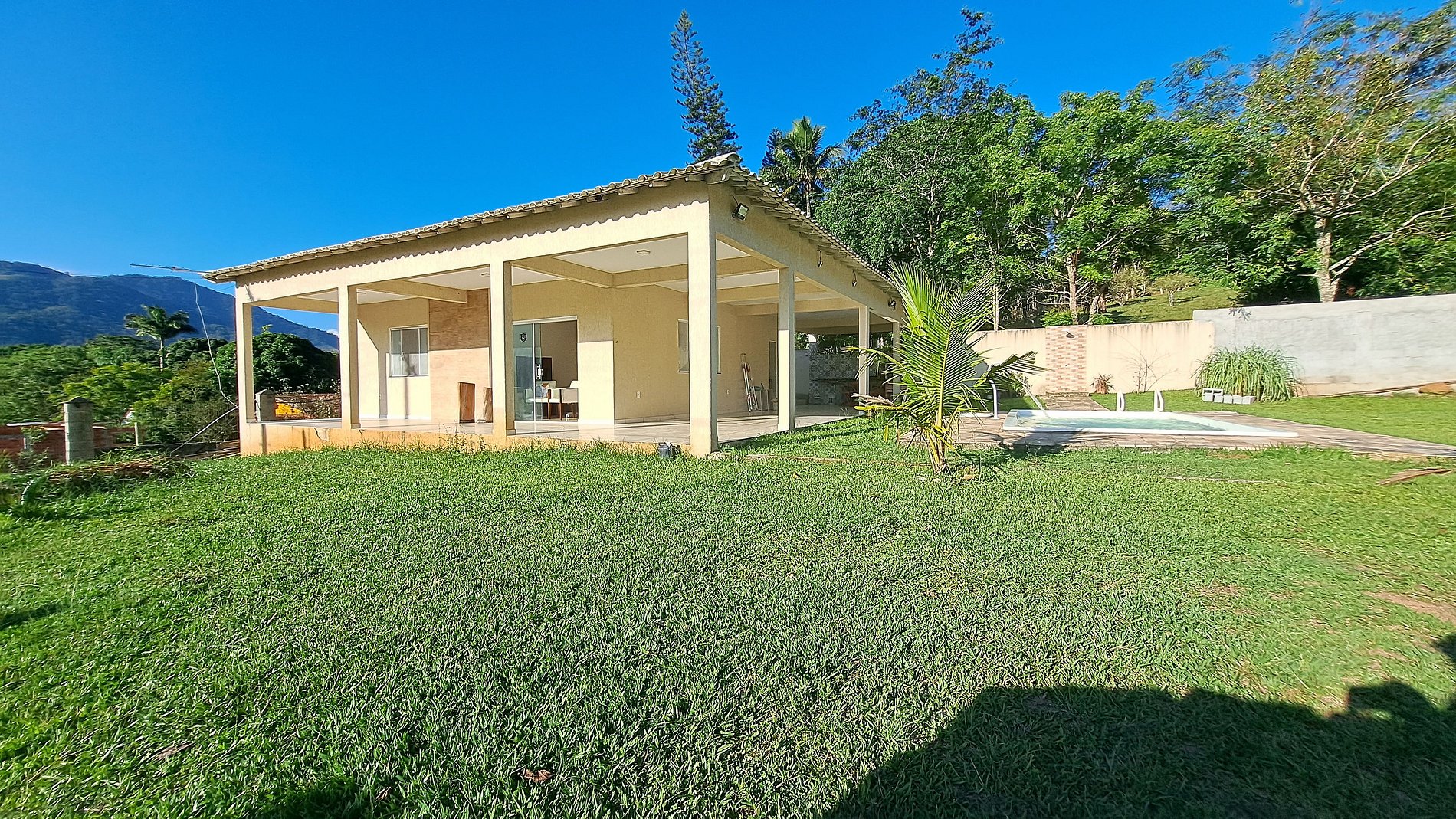 Immersed in a mountain landscape, large grassy backyard with swimming pool and barbecue.
