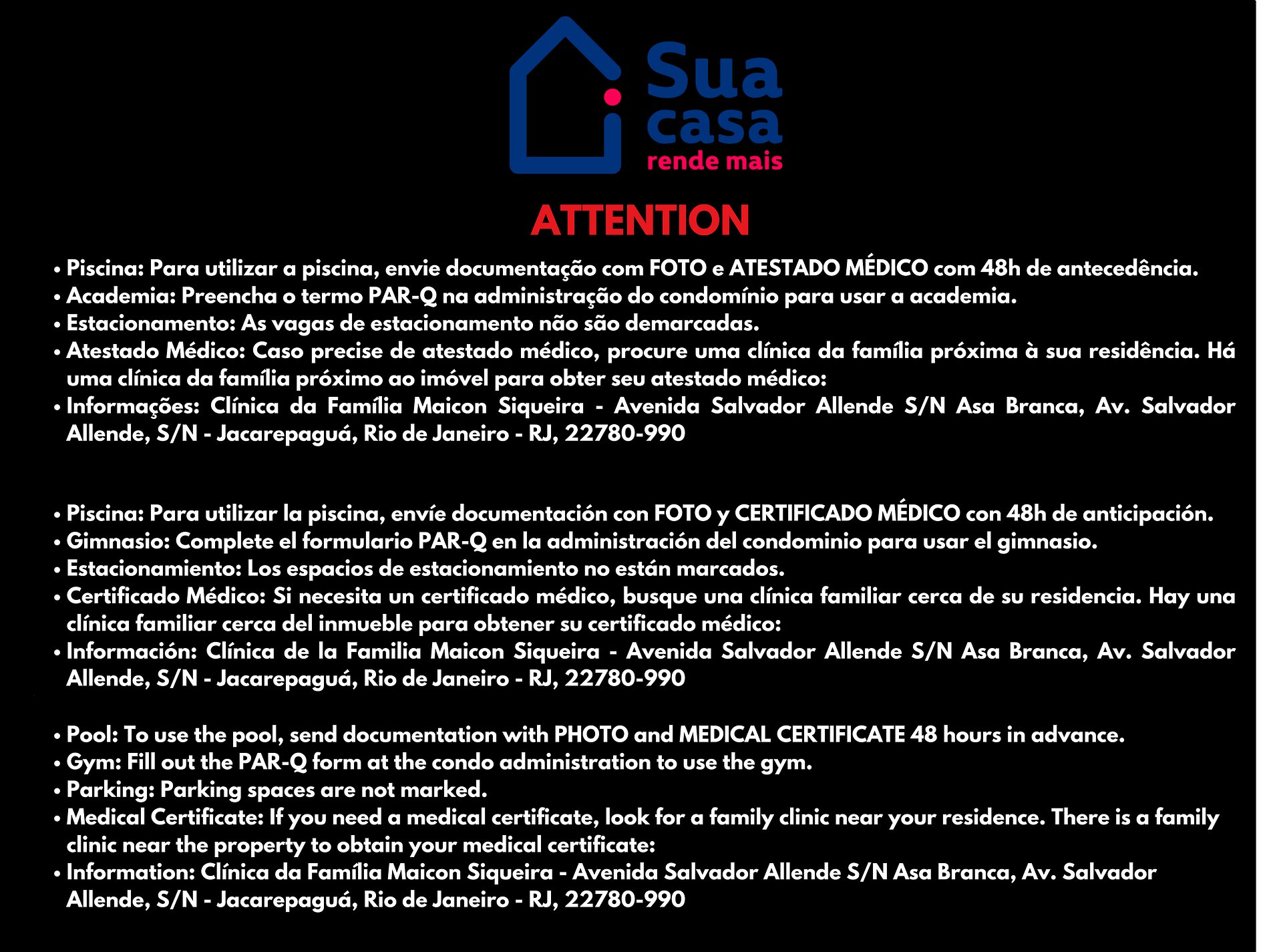 Piscina: Para utilizar a piscina, envie documentação com FOTO e ATESTADO MÉDICO com 48h de antecedência.