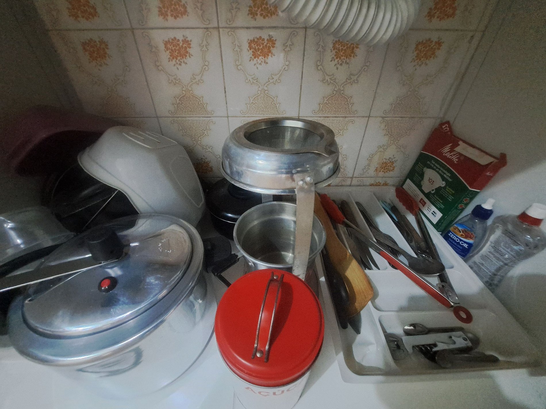 -- Cozinha equipada com fogão, geladeira, micro-ondas, cafeteira, pratos, copos e utensílios básicos.