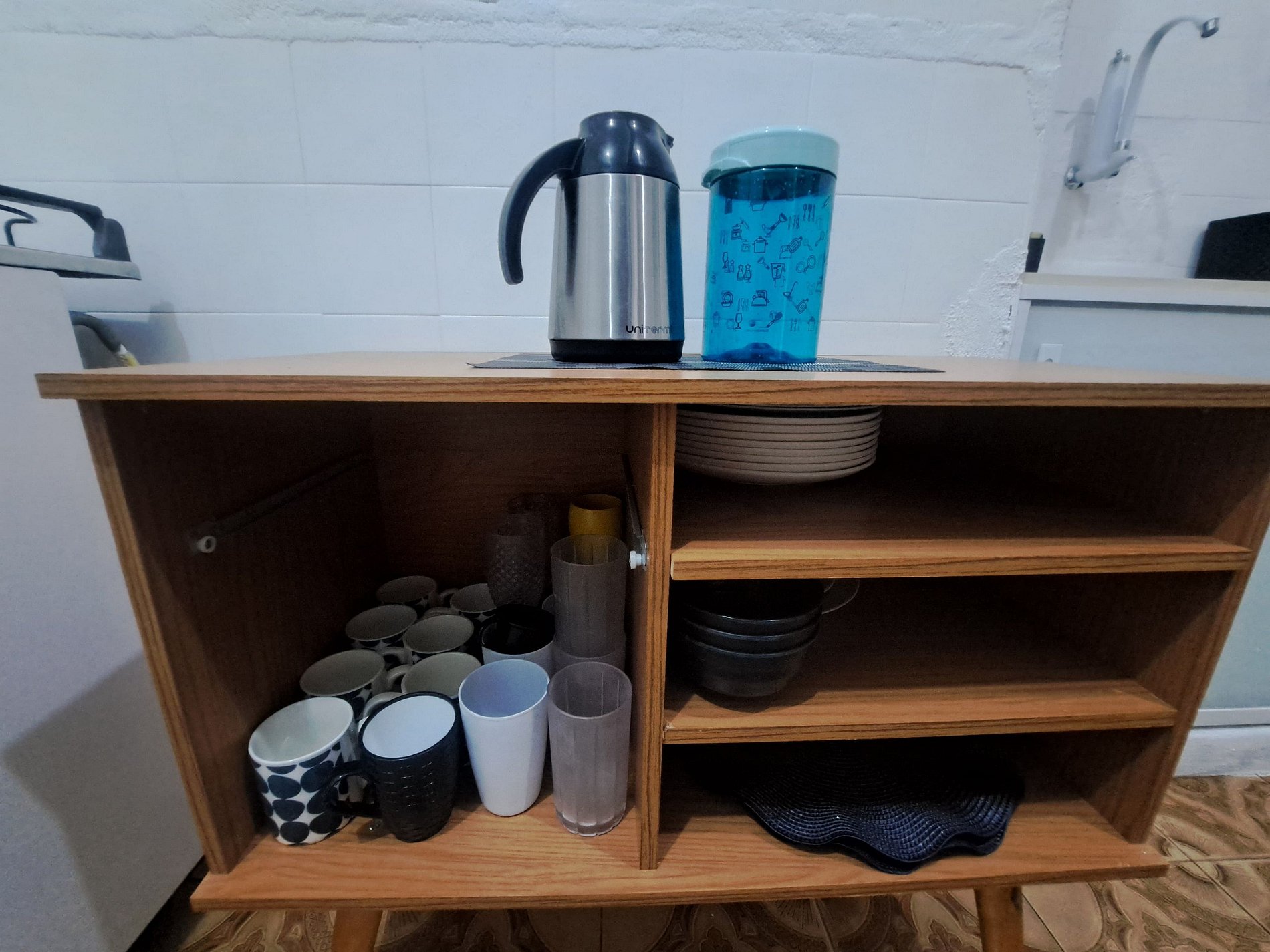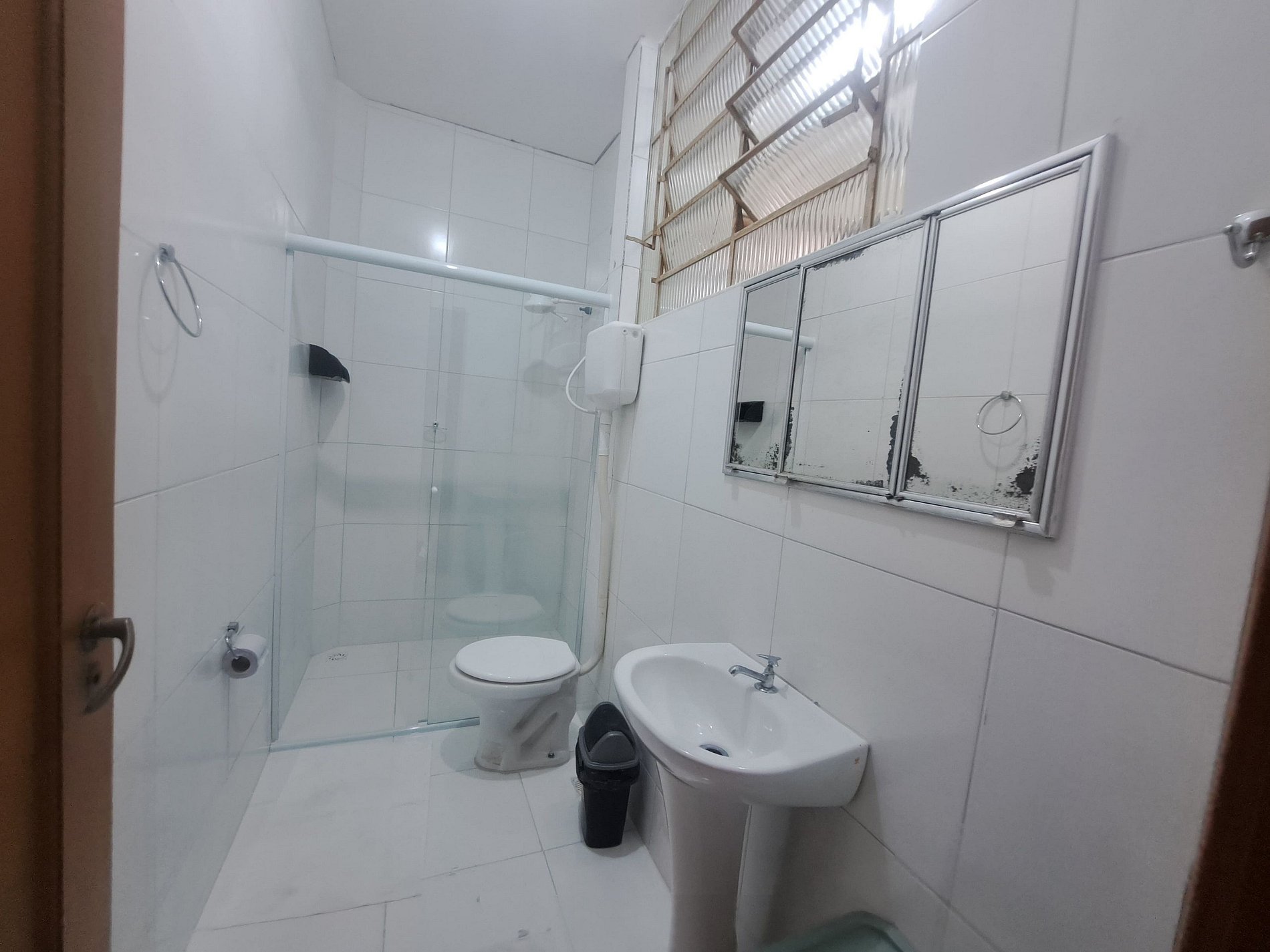 A cozinha é espaçosa e funcional, com utensílios básicos para preparo de refeições e espaço para refeições rápidas ou mais tranquilas. O banheiro é claro, com ventilação natural e box em vidro, garantindo conforto e higiene.