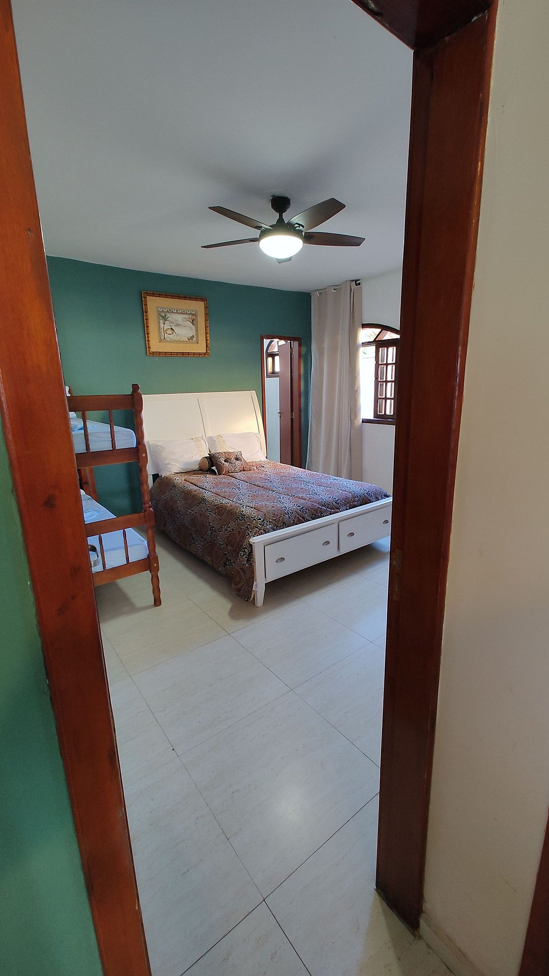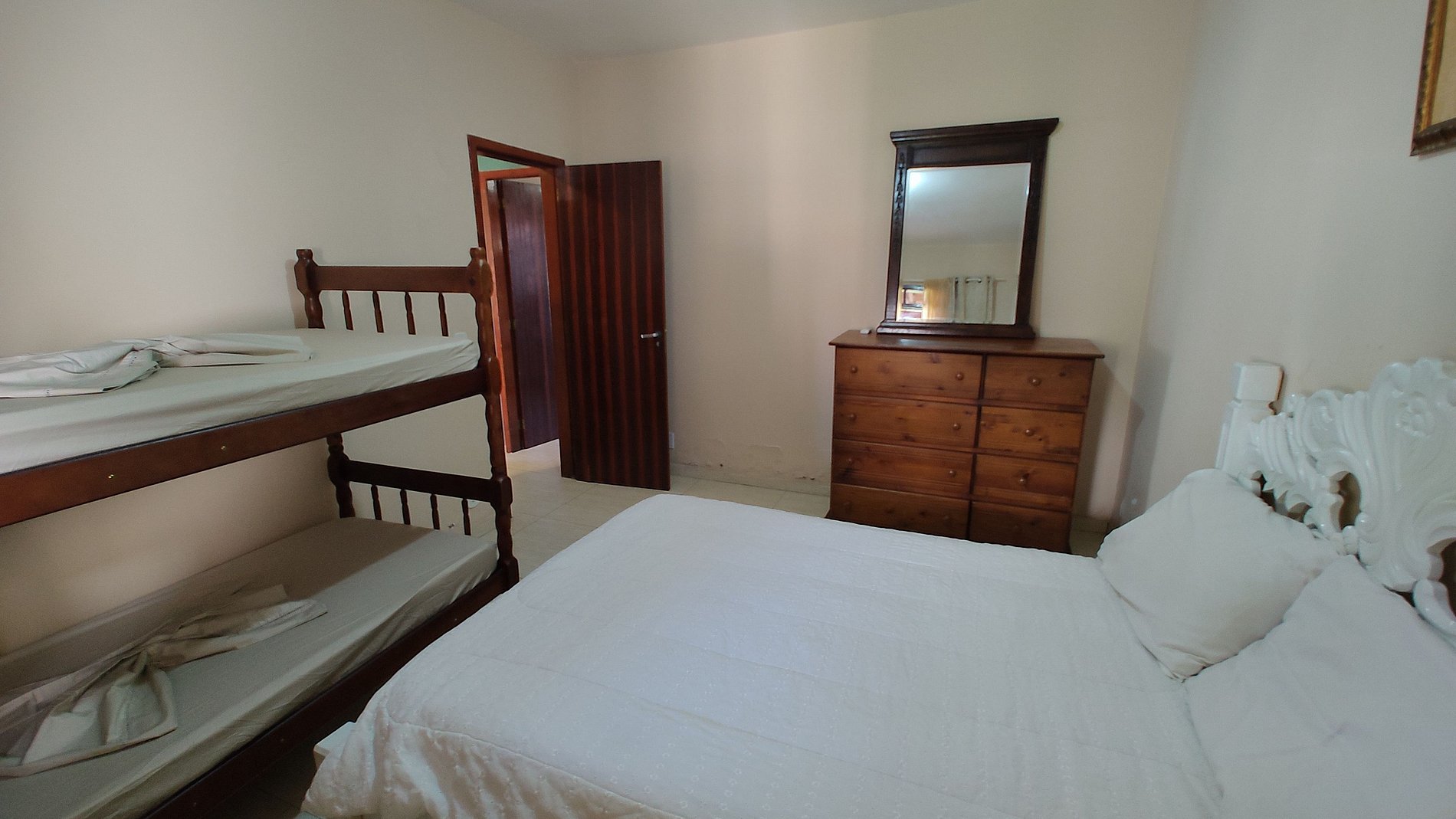 2 suítes com cama de casal e beliche e um quarto com banheiro externo com cama de casal e beliche tambem. Churrasqueira e plena área de lazer, banheiro e ducha externos
