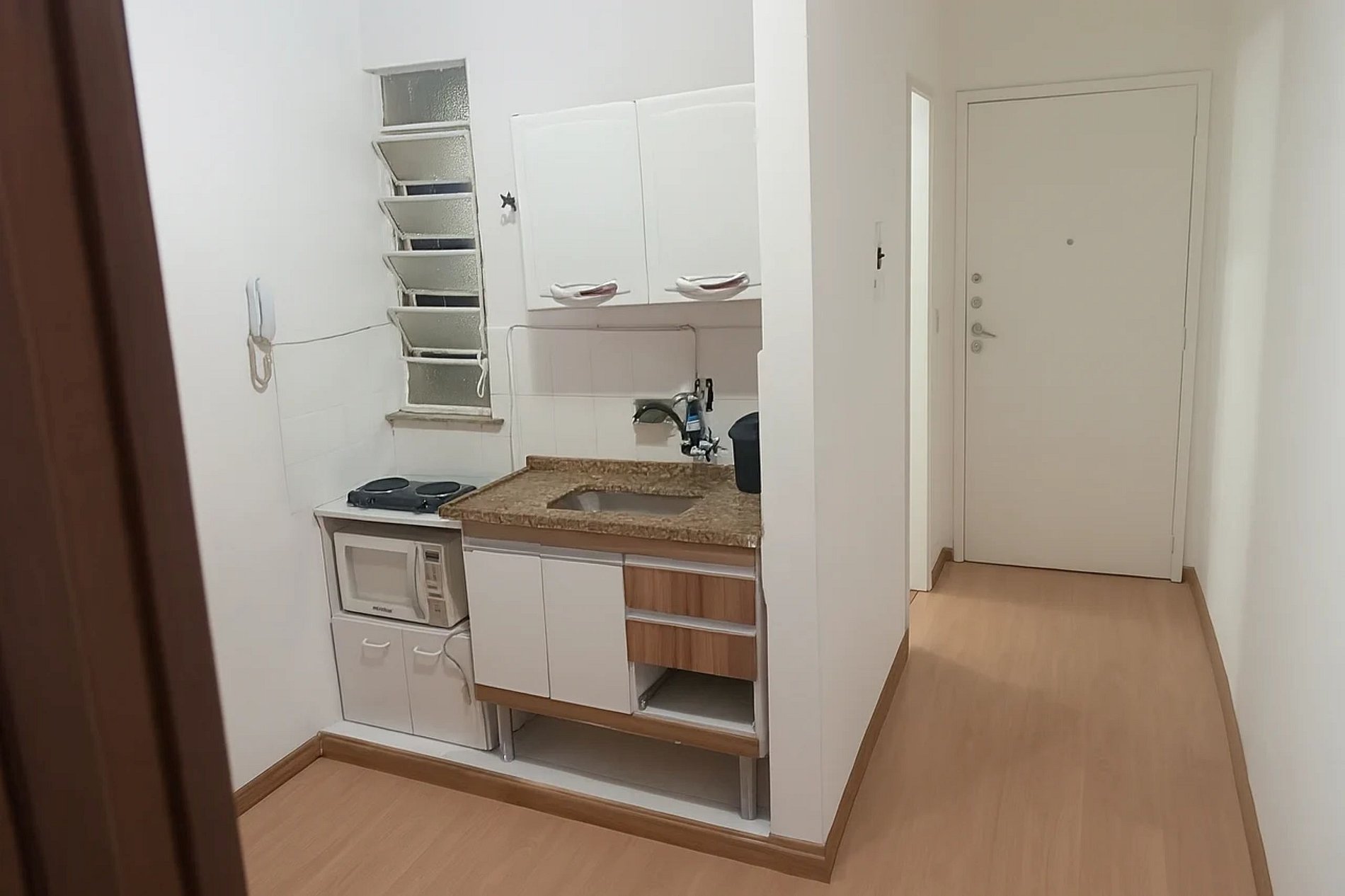 Cozinha compacta, mas muito funcional! Equipada com utensílios básicos, panelas, micro-ondas e um fogão elétrico de duas bocas – perfeita para preparar aquele café da manhã reforçado ou um jantar rápido depois de explorar a cidade.