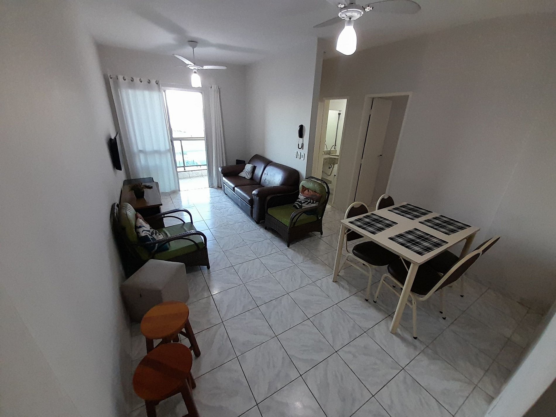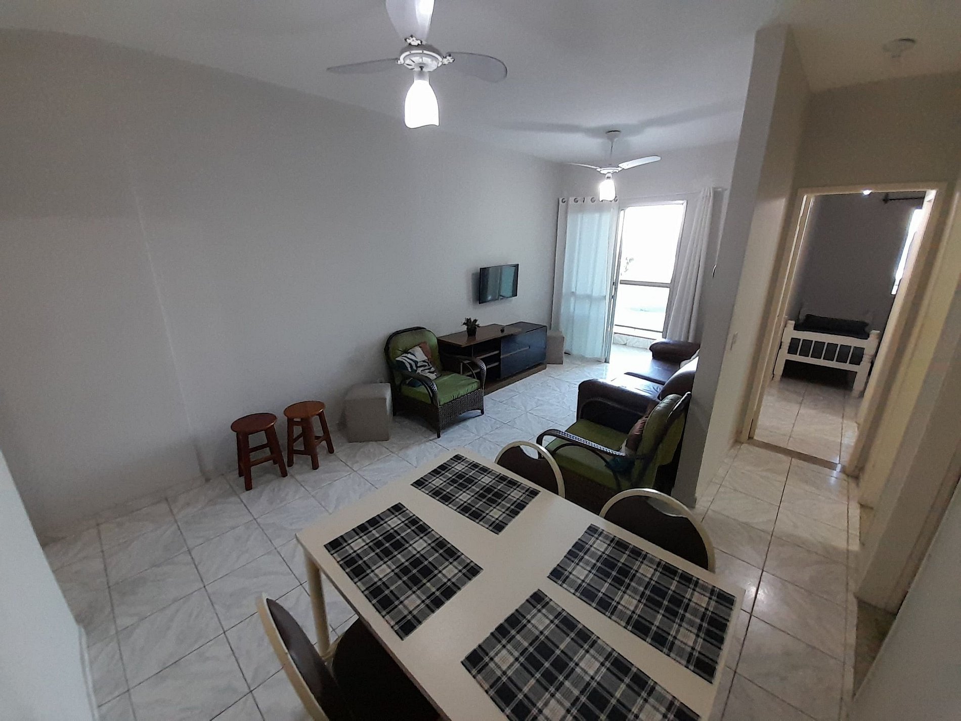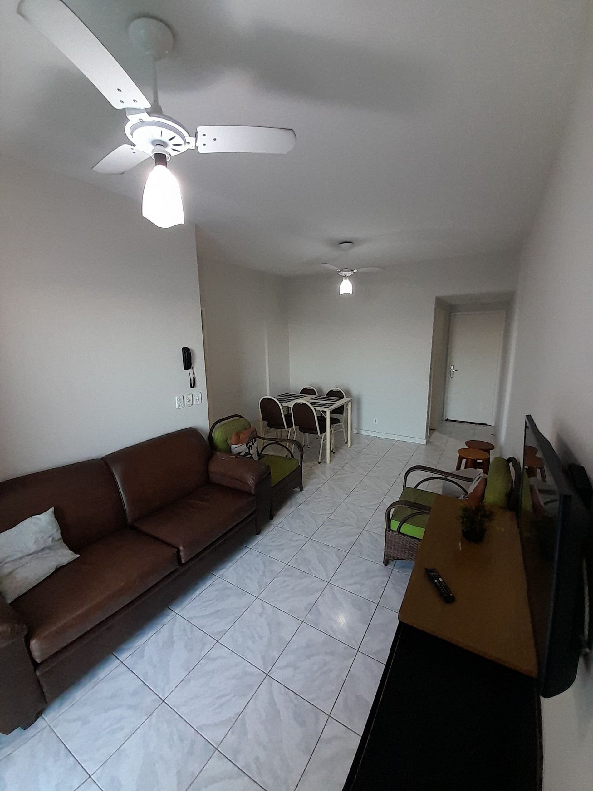 A sala é integrada à varanda, proporcionando momentos agradáveis com vista e ventilação natural. Os quartos contam com ventiladores e boa luminosidade.