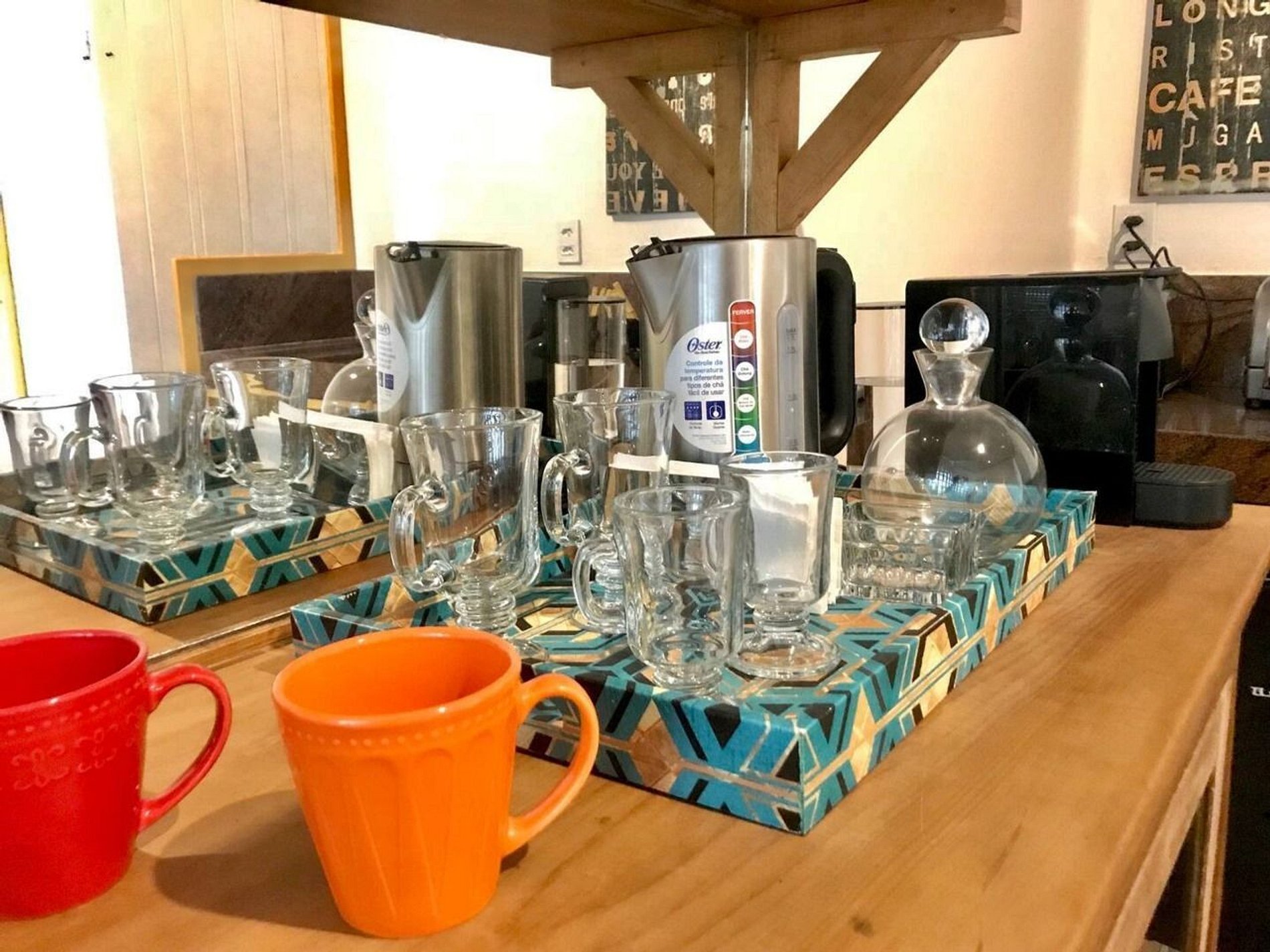 A cozinha de apoio conta com mesa para refeições, chaleira elétrica, cafeteira, torradeira, forninho, cooktop de 1 boca e taças de vinho, entre outros. Oferece praticidade para preparar cafés, lanches e pequenas refeições.