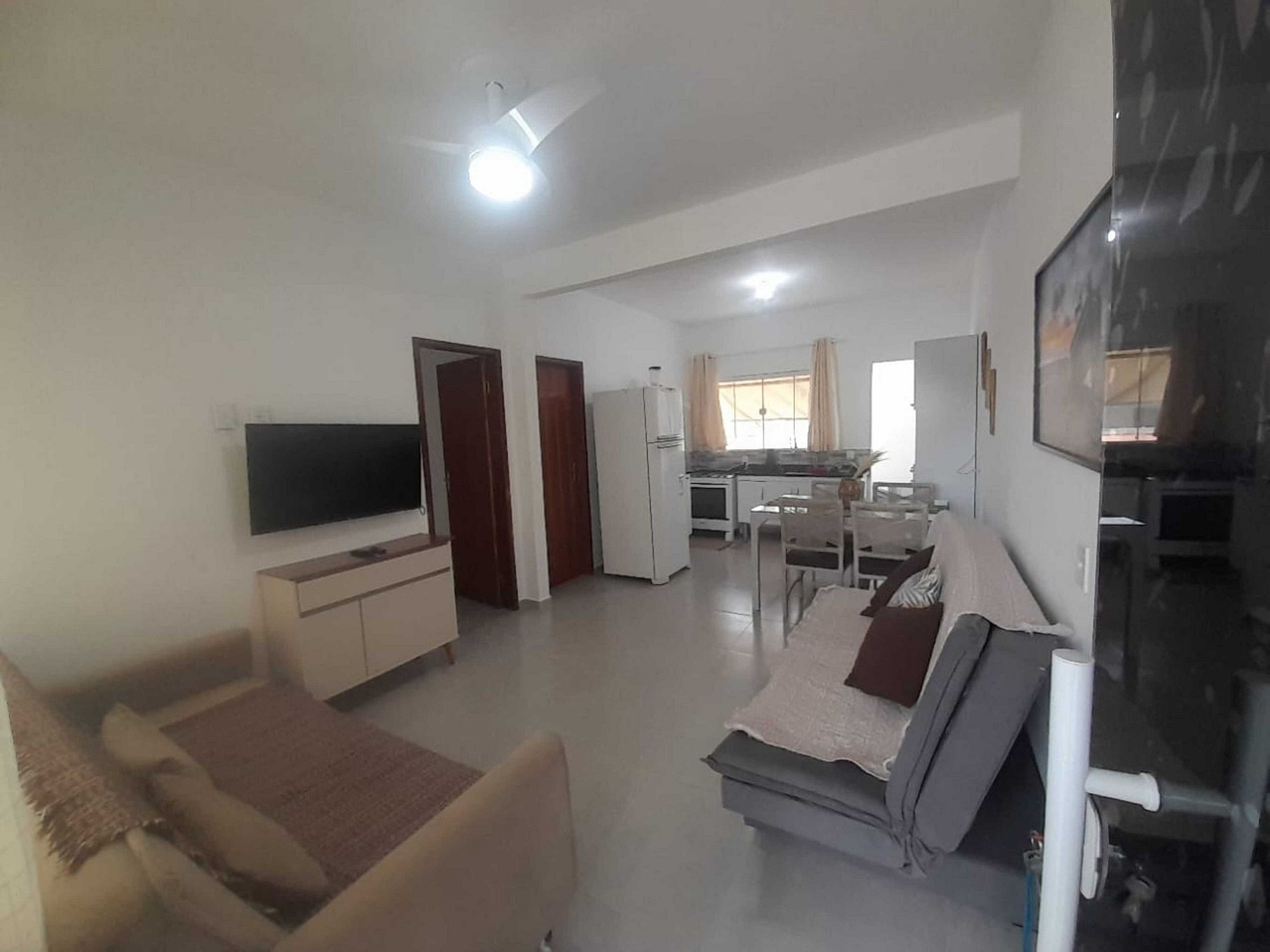 O quarto acomoda 4 pessoas em um quarto com cama de casal e beliche. O ambiente é novinho, iluminado e bem ventilado, com ar-condicionado, banheiro funcional e uma cozinha equipada com fogão, geladeira, utensílios essenciais e balcão com banquetas. A sala conta com sofá, TV e ventilador de teto, garantindo conforto nos dias mais quentes.