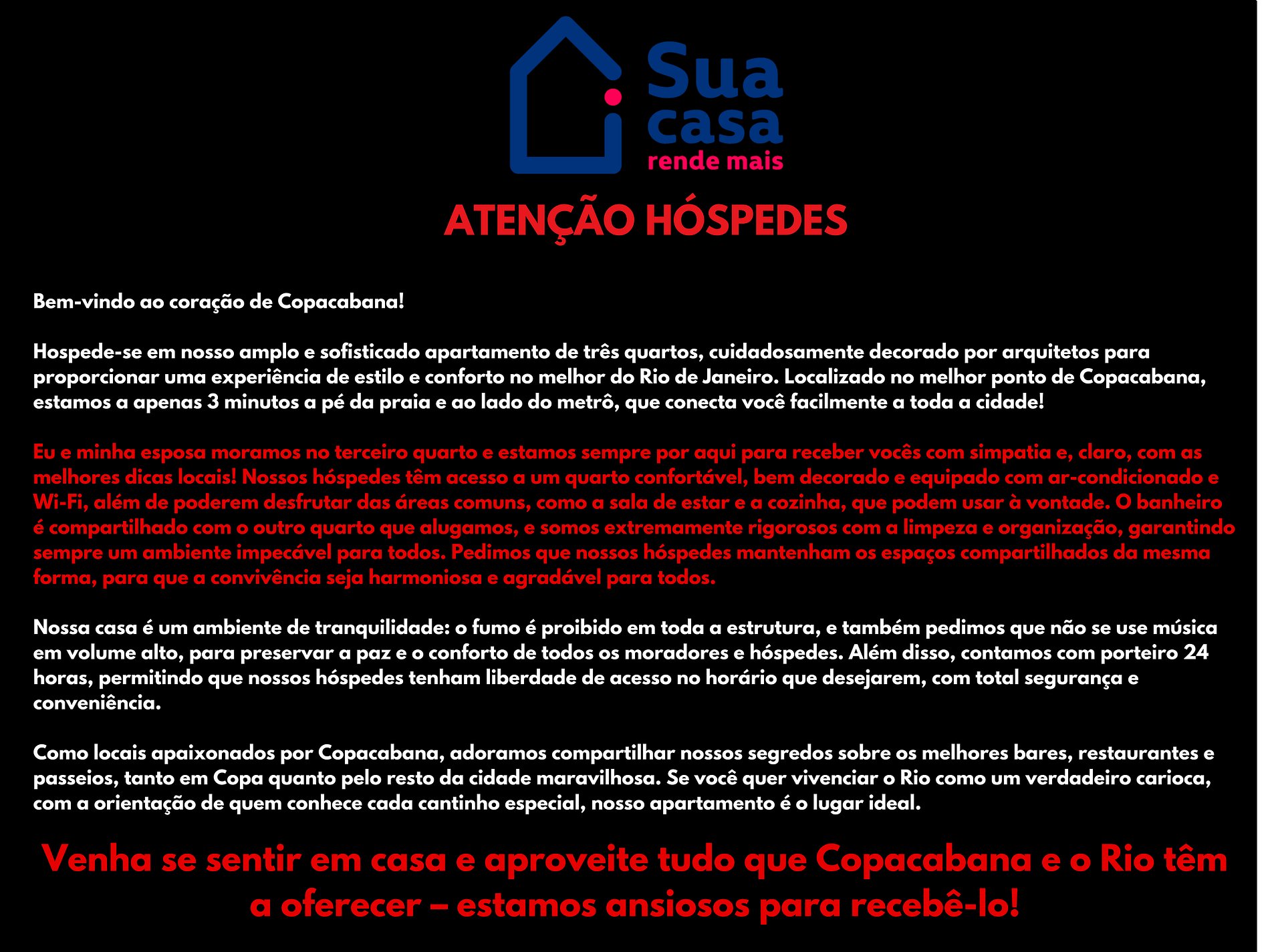 Venha se sentir em casa e aproveite tudo que Copacabana e o Rio têm a oferecer – estamos ansiosos para recebê-lo!