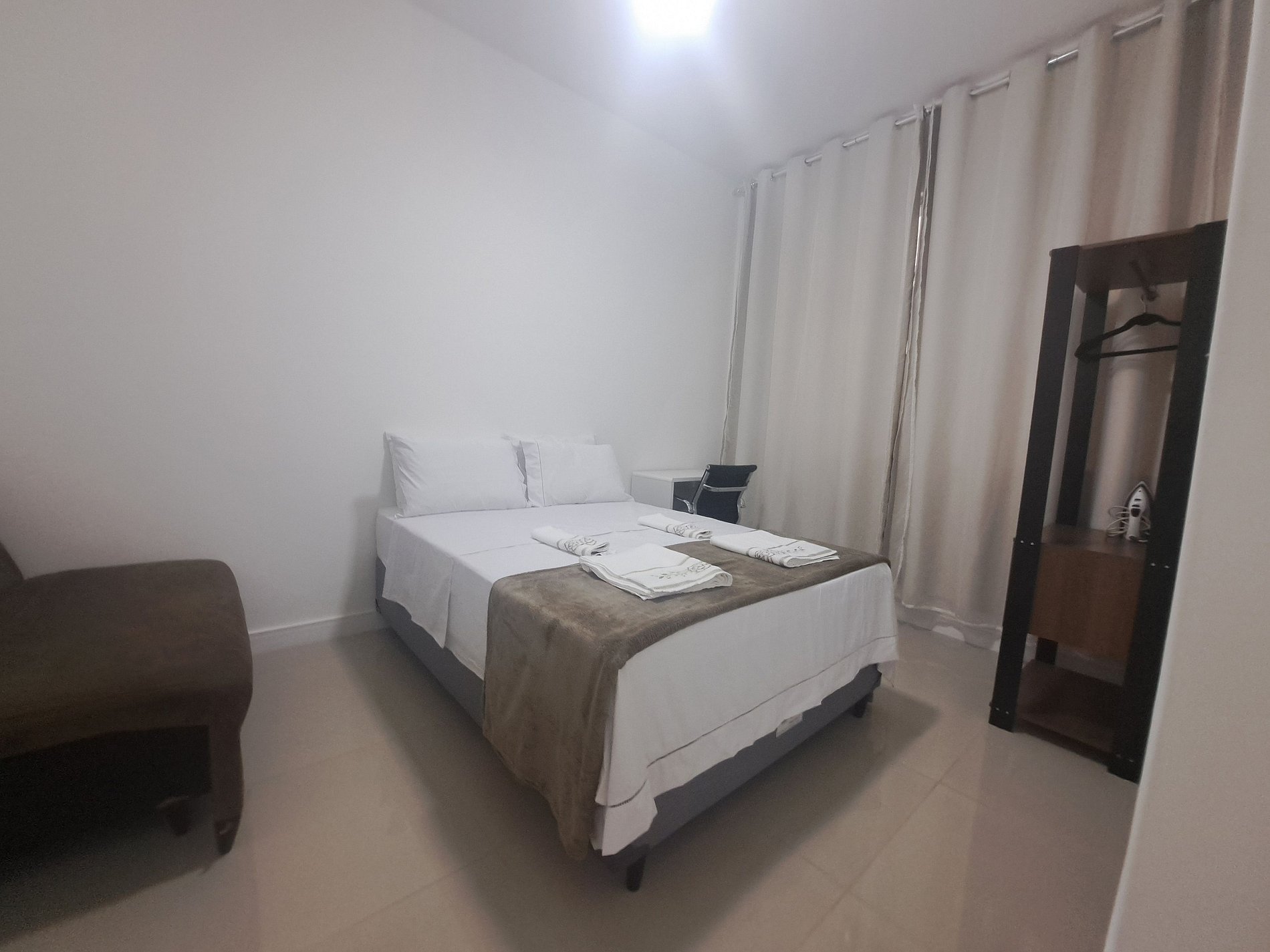 A sala de estar, equipada com uma TV, é perfeita para relaxar. A cozinha completa com fogão, geladeira, micro-ondas e air fryer permite que você prepare suas refeições favoritas.