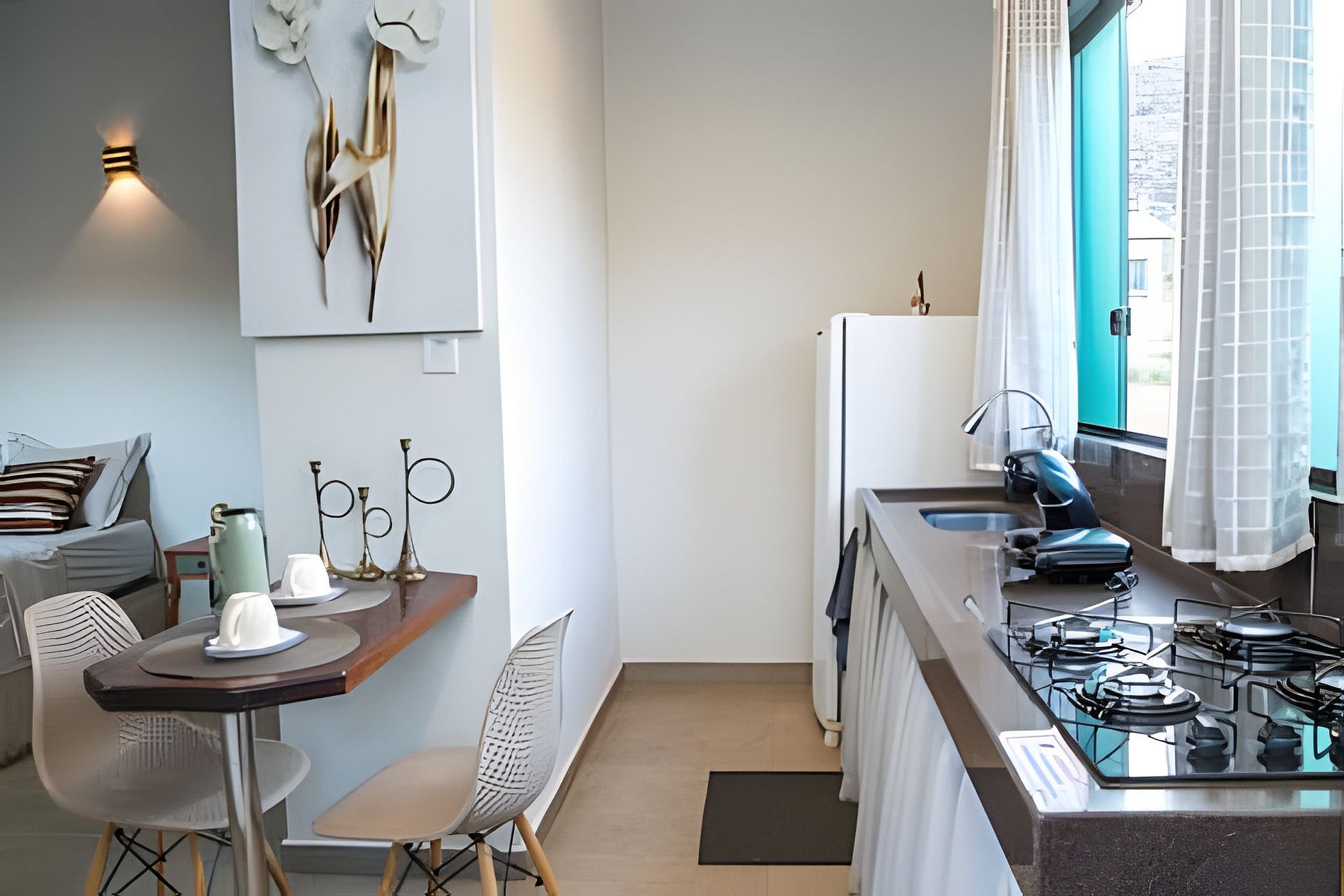 Ainda, o loft possui um banheiro amplo com box blindex e lavabo, e uma cozinha totalmente equipada para que você prepare suas refeições com toda a comodidade. Da janela, uma vista deslumbrante das montanhas da Lapinha serve de cenário para seus momentos inesquecíveis. E para o conforto dos pequenos, também oferecemos um colchão de solteiro extra.