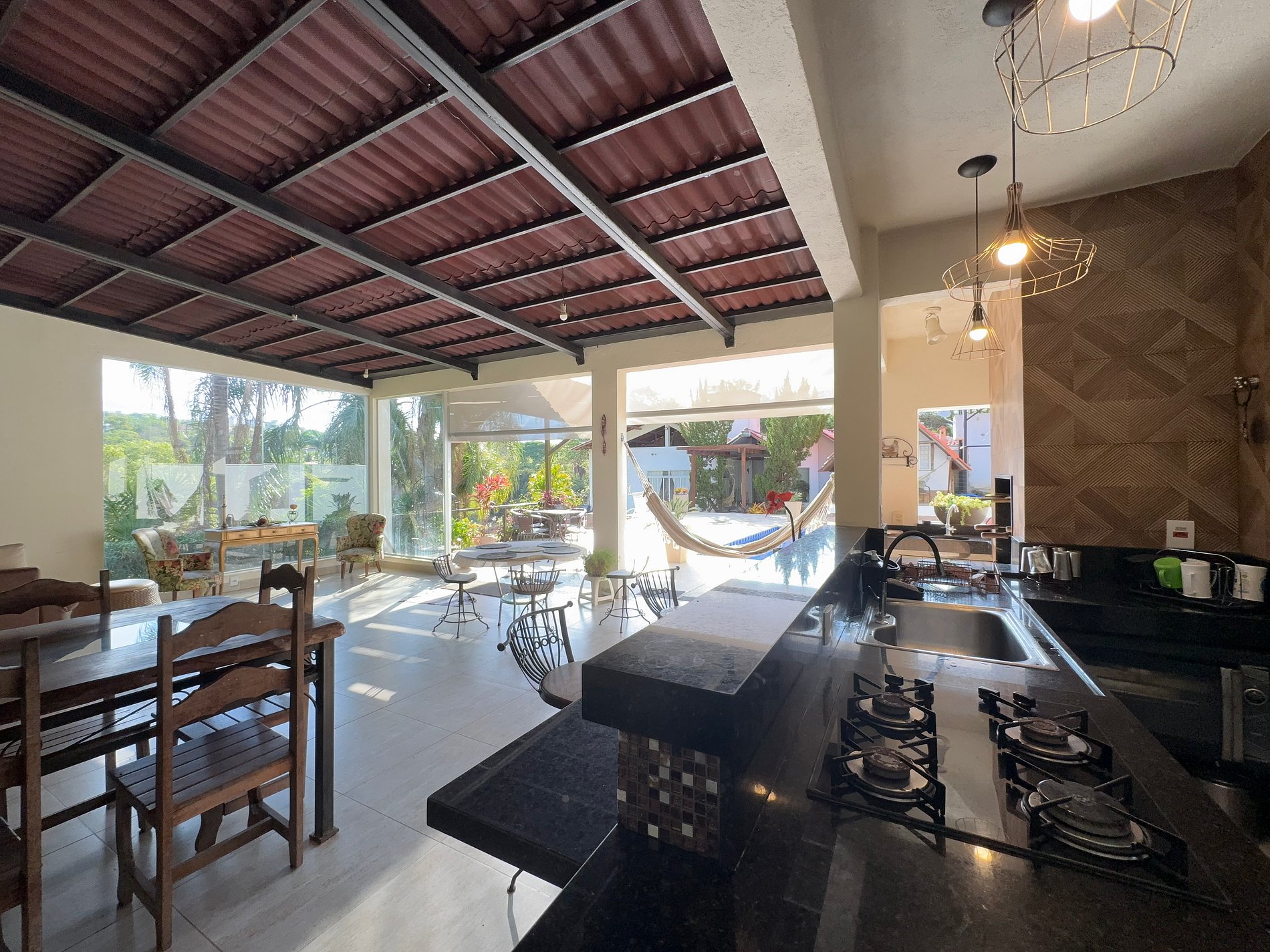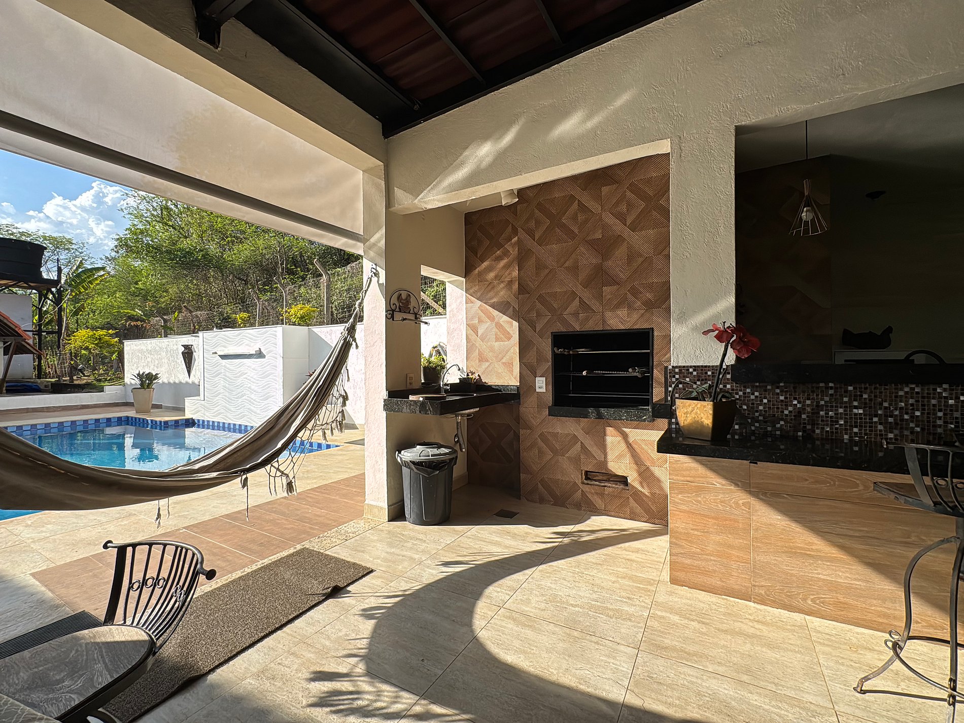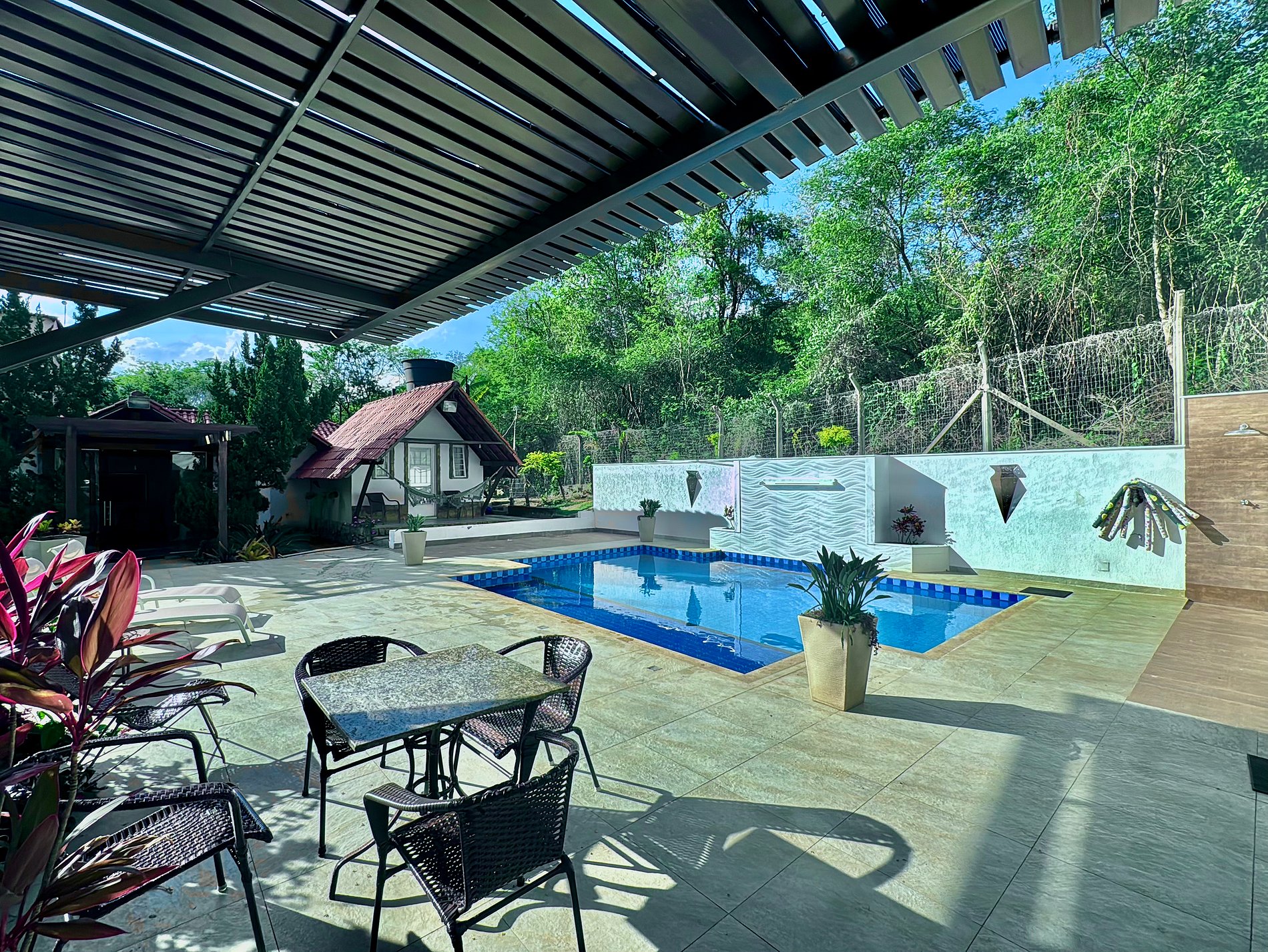 O design do sítio privilegia a luz natural e a ventilação, com espaços amplos e abertos que conectam você à natureza. O ponto central é a deslumbrante área de lazer, onde uma bela piscina com cascata convida ao relaxamento. Ao lado, um espaço gourmet completo com churrasqueira e cozinha equipada se integra perfeitamente à varanda, permitindo que todos socializem em um único ambiente.
