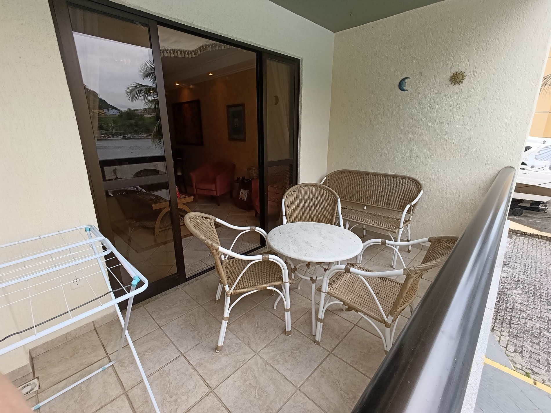 Um dos grandes destaques do imóvel é a varanda privativa, equipada com mesa e cadeiras, perfeita para relaxar, tomar um café ou apreciar a vista para a piscina e para a orla da praia, com o cenário natural típico de Angra dos Reis.