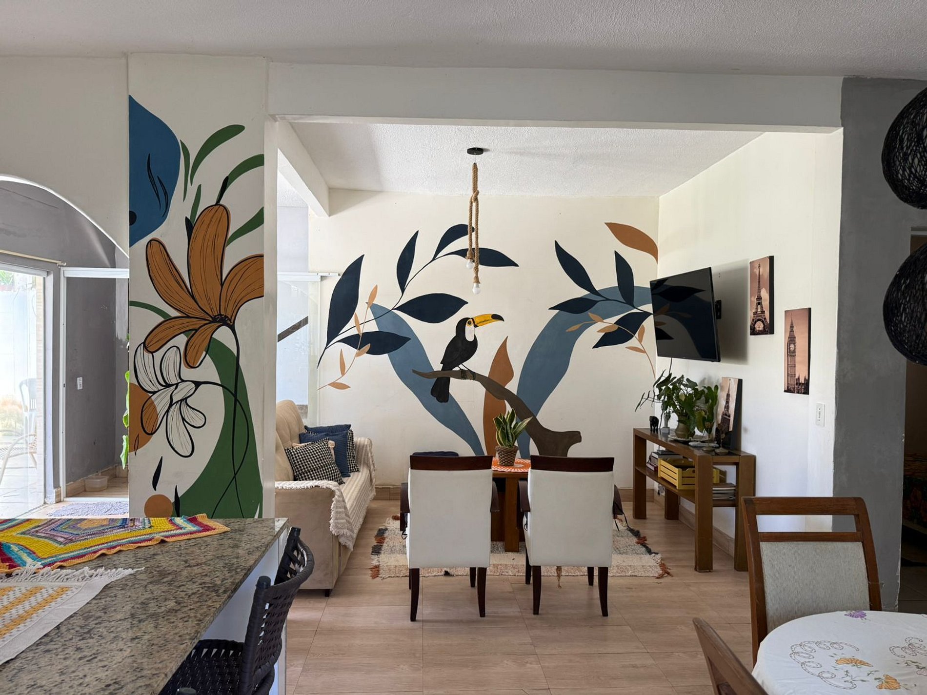 Sala de Estar: Ambiente integrado com decoração aconchegante, TV e sofás confortáveis.