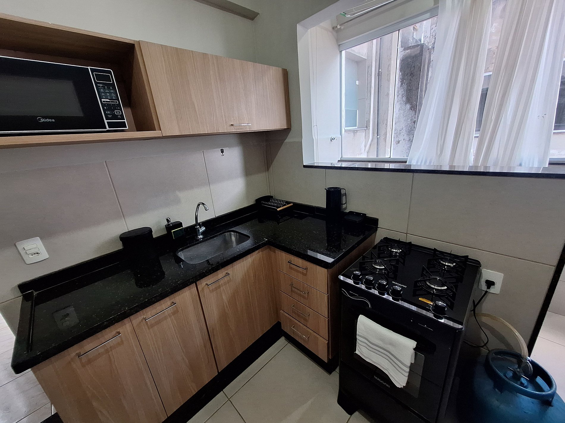 O apartamento conta com 1 quarto confortável, bem iluminado, com cama de casal e um sofá-cama para casal, ventilador de teto, armários e cortinas blackout, garantindo noites de descanso agradáveis. O banheiro é moderno, com água quente, bom espaço e acabamento clean.