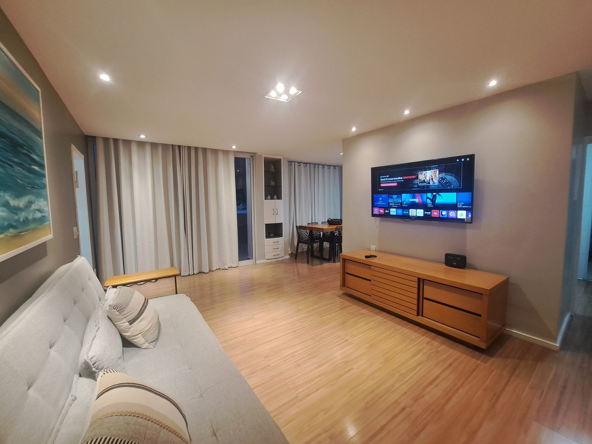Sala de Estar Espaçosa: Um ambiente amplo e integrado, com piso laminado elegante, sofá muito confortável, ar-condicionado Split potente e uma Smart TV de tela grande (com acesso a apps de streaming). Há também uma área dedicada para Home Office com mesa e cadeira, ideal para nômades digitais.