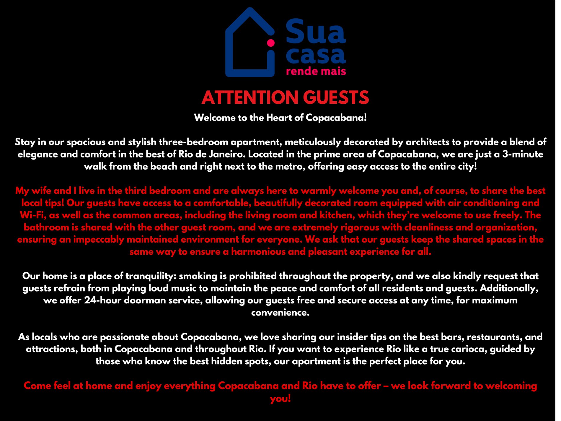 Como locais apaixonados por Copacabana, adoramos compartilhar nossos segredos sobre os melhores bares, restaurantes e passeios, tanto em Copa quanto pelo resto da cidade maravilhosa. Se você quer vivenciar o Rio como um verdadeiro carioca, com a orientação de quem conhece cada cantinho especial, nosso apartamento é o lugar ideal.