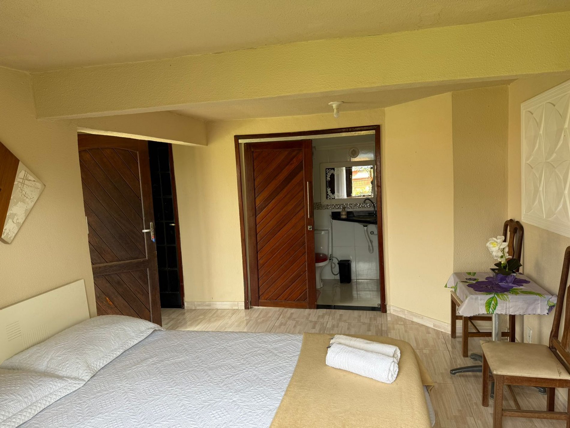 SUITE 02: Até 3 hóspedes contando com 1 cama de solteiro e uma de casal, AC, Wi-Fi e Smart TV.