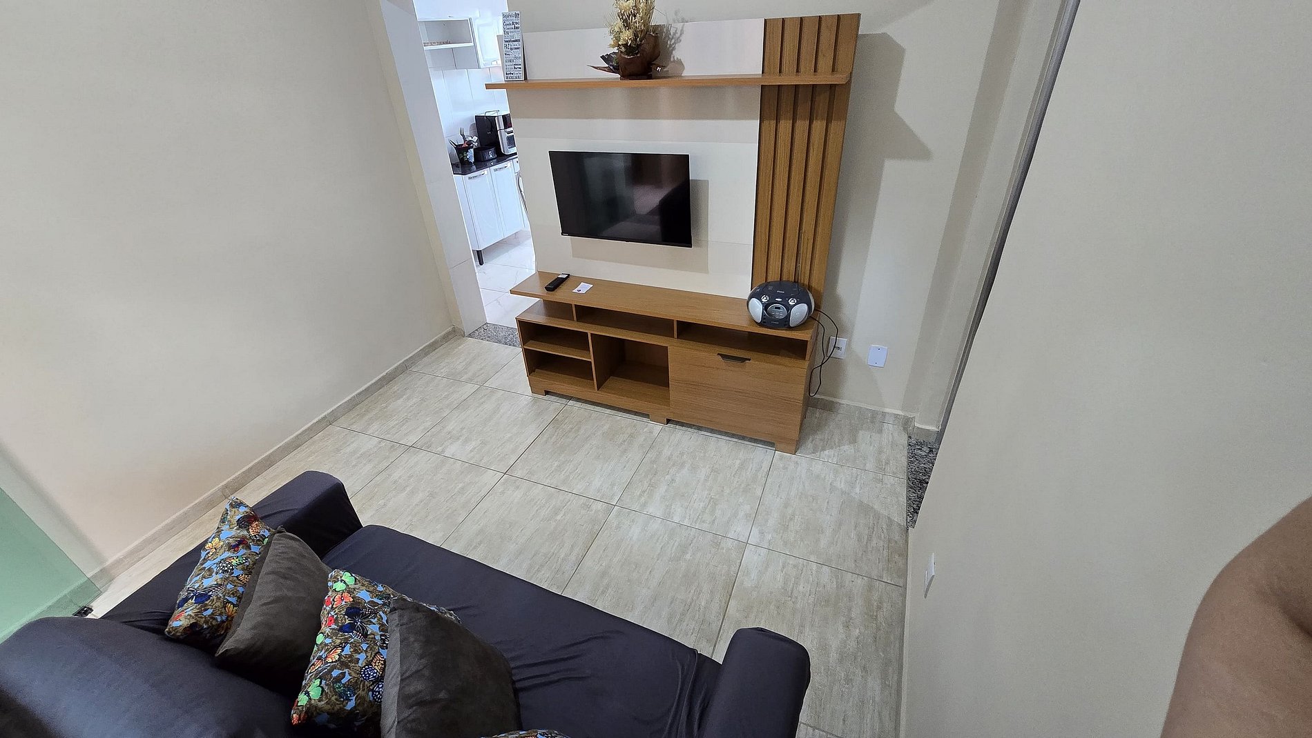 Sala: Ampla e confortável, equipada com sofá cama de casal e TV Smart.