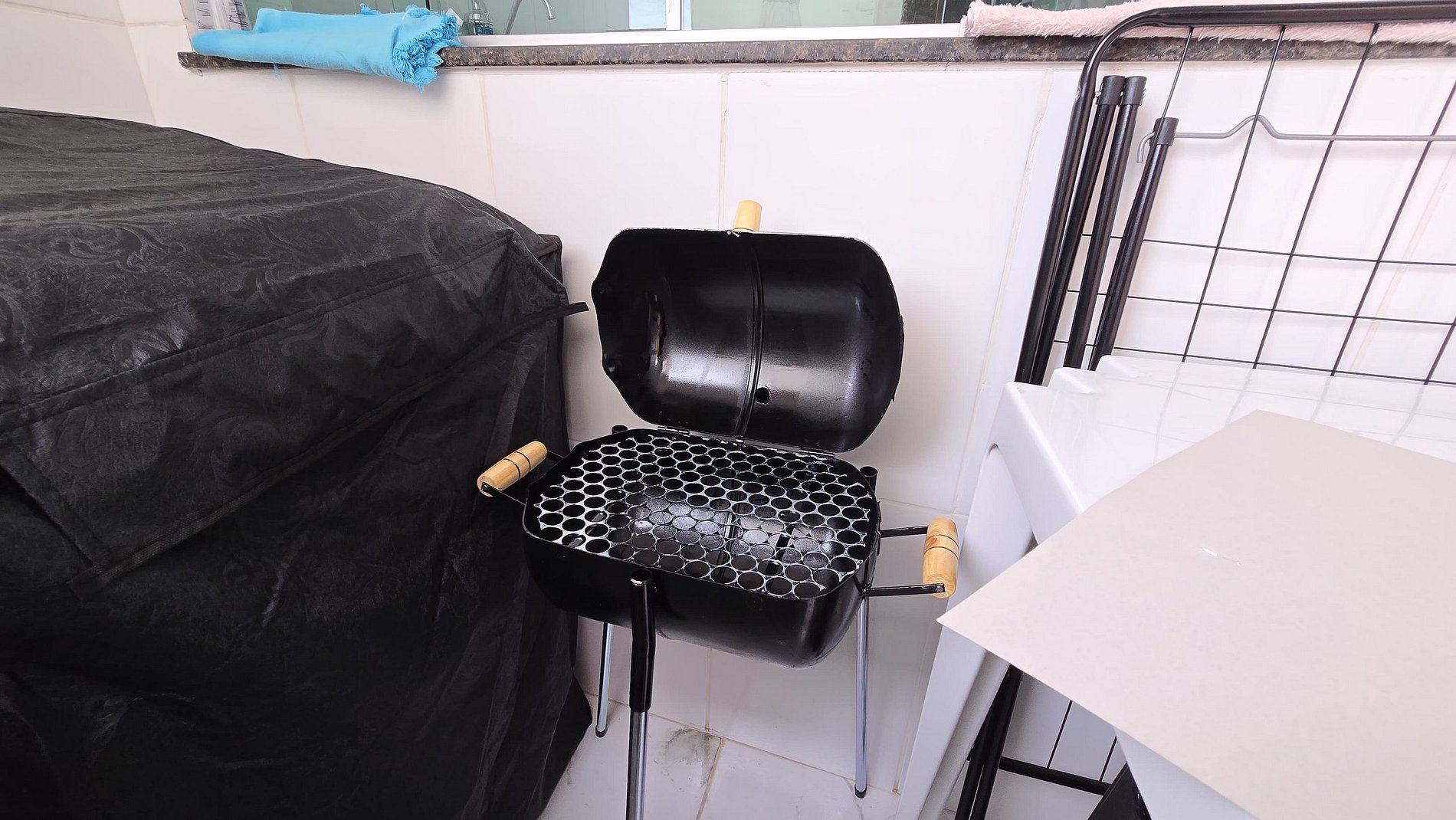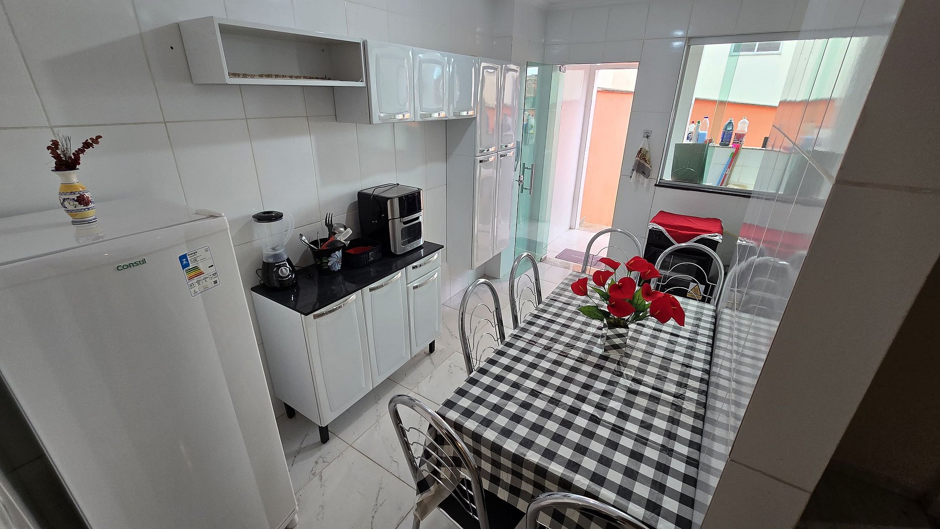 Área Externa: Espaço com churrasqueira, cadeiras e mesa para seu lazer